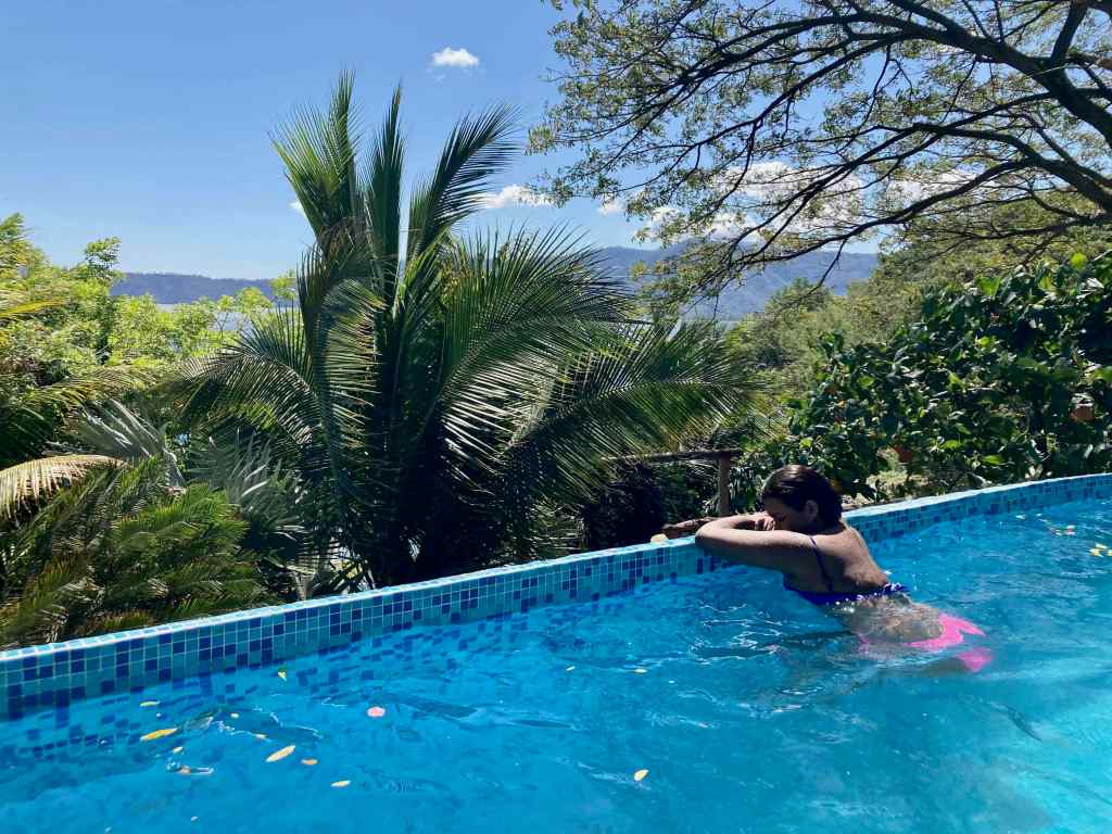 Para esta aventura, el hotel que nos recibió fue el Hotel Selva Azul, donde pasamos 3 días y 2 noches disfrutando los alrededores de la Laguna. La cabaña estilo rústica en la que estuvimos nos dejó completamente enamorados. Tenía una piscina y una sala exterior con vista directa a la Laguna de Apoyo. Así que por las noches pudimos disfrutar de la brisa que corre mientras veíamos una serie de Netflix frente a la piscina.